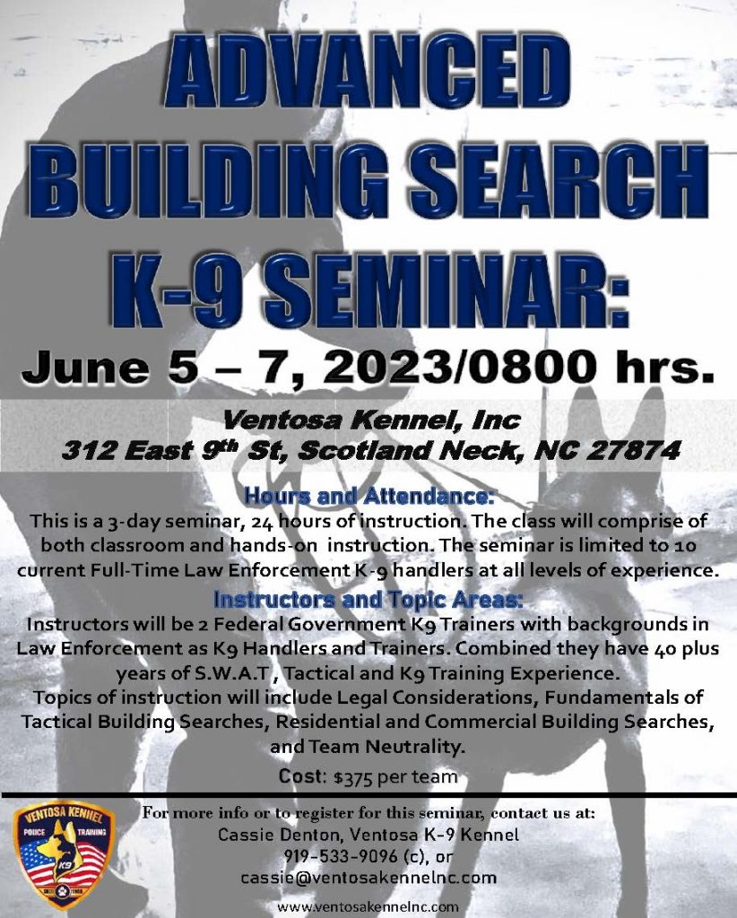 The 4-day E-Collar Seminar will take place at Ventosa’s Training Facility and will be open to 10 participants (current Law Enforcement Officers only). The class will comprise of both classroom instruction and practical use of the systems with canines. Participants will need toys, tugs, back ties, and harness. Participants do not NEED their own E-collar system, but beneficial to have during the class.